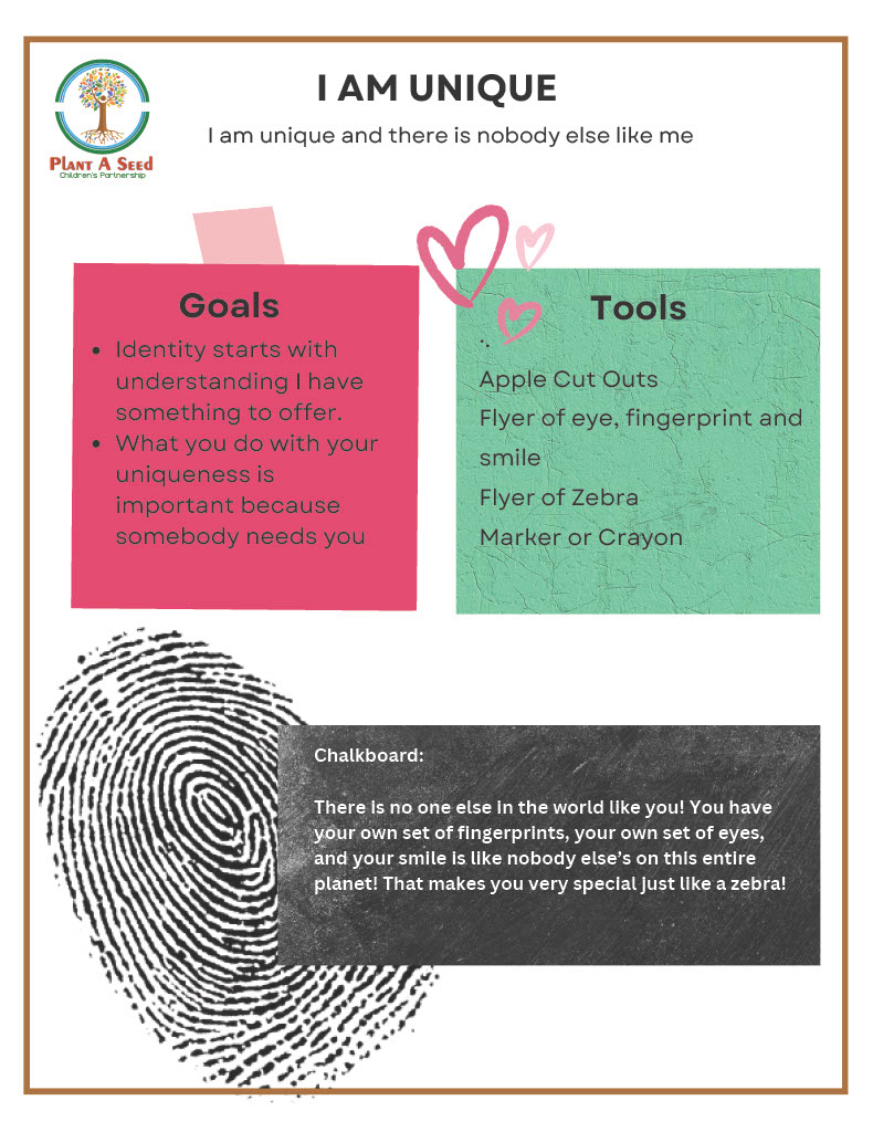 Unit 1: Lesson 4 I AM UNIQUE I am unique and there is nobody else like me Identity starts with understanding I have something to offer. What you do with your uniqueness is important because somebody needs you Collect lesson recourses (or refer to Getting to Know you packet in materials kit)Download Lesson PDFPrint worksheets Unit 1 Lesson 4 I am unique.pdf Home I have completed this lesson Next Lesson