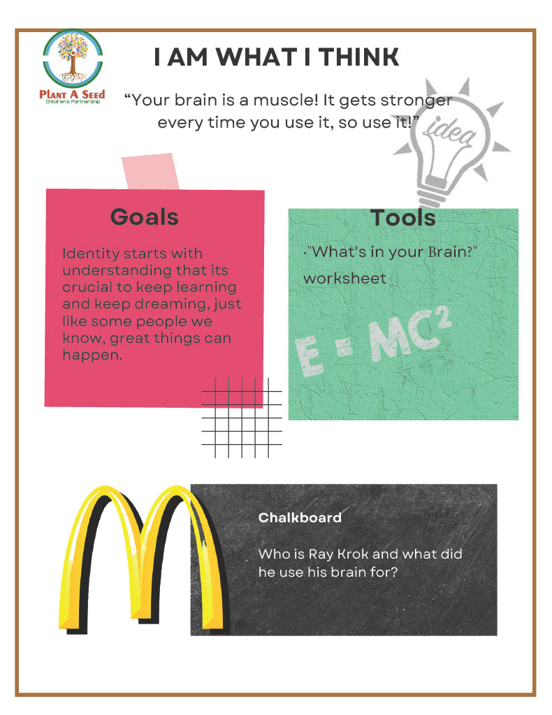 Unit 1: Lesson 7 I AM WHAT I THINK Your brain is a muscle! It gets stronger every time you use it, so use it! Identity starts with understanding that its crucial to keep learning and keep dreaming, just like some people we know, great things can happen. Collect lesson recourses (or refer to Getting to Know you packet in materials kit)Download Lesson PDFPrint worksheets Unit 1 Lesson 7 I am what i think.pdf Home I have completed this lesson Next Lesson